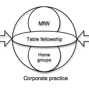 Personal practice, corporate practice and evangelism all feed and support each other. Personal practice and evangelism can take many forms, hence the varied circles within circles. You will notice I have placed three specific elements within our corporate practice. I will come back to those later!