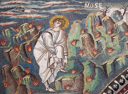 This is an early sixth century mosaic from the Church of St. Vitale in Ravenna, Italy. I was introduced to this image by Rita Nakashima Brock & Rev. Dr. Rebecca Parker’s book ‘Saving Paradise’ (2012). It depicts Moses’ encounter with God, speaking to him from a burning bush. A youthful, clean-shaven Moses is untying his sandals, for he is on holy ground. You’ll notice that the mountainside is covered in burning shrubbery. The whole earth is aflame with the Divine Presence and we just haven’t noticed. God declares the whole of creation as holy ground, not just the temples and sacred groves. In the Eastern Orthodox tradition, fire is always associated with God’s love, in its life-giving, purifying and transforming light and heat. You can’t maintain a spiritual practice and remain lukewarm for long. Divine encounter reveals the extent of the world’s darkness, as well as its awe-inspiring magnificence. George Fox was opened to such a vision: ‘I saw also that there was an ocean of darkness and death, but an infinite ocean of light and love, which flowed over the ocean of darkness. And in that also I saw the infinite love of God; and I had great openings.’ George Fox, Journal (1647) [QF&P 19.03]. This is what attention to our selves as spiritual people can reveal. We are all invited, like Moses, to take off our sandals where we are, and see the world aflame.