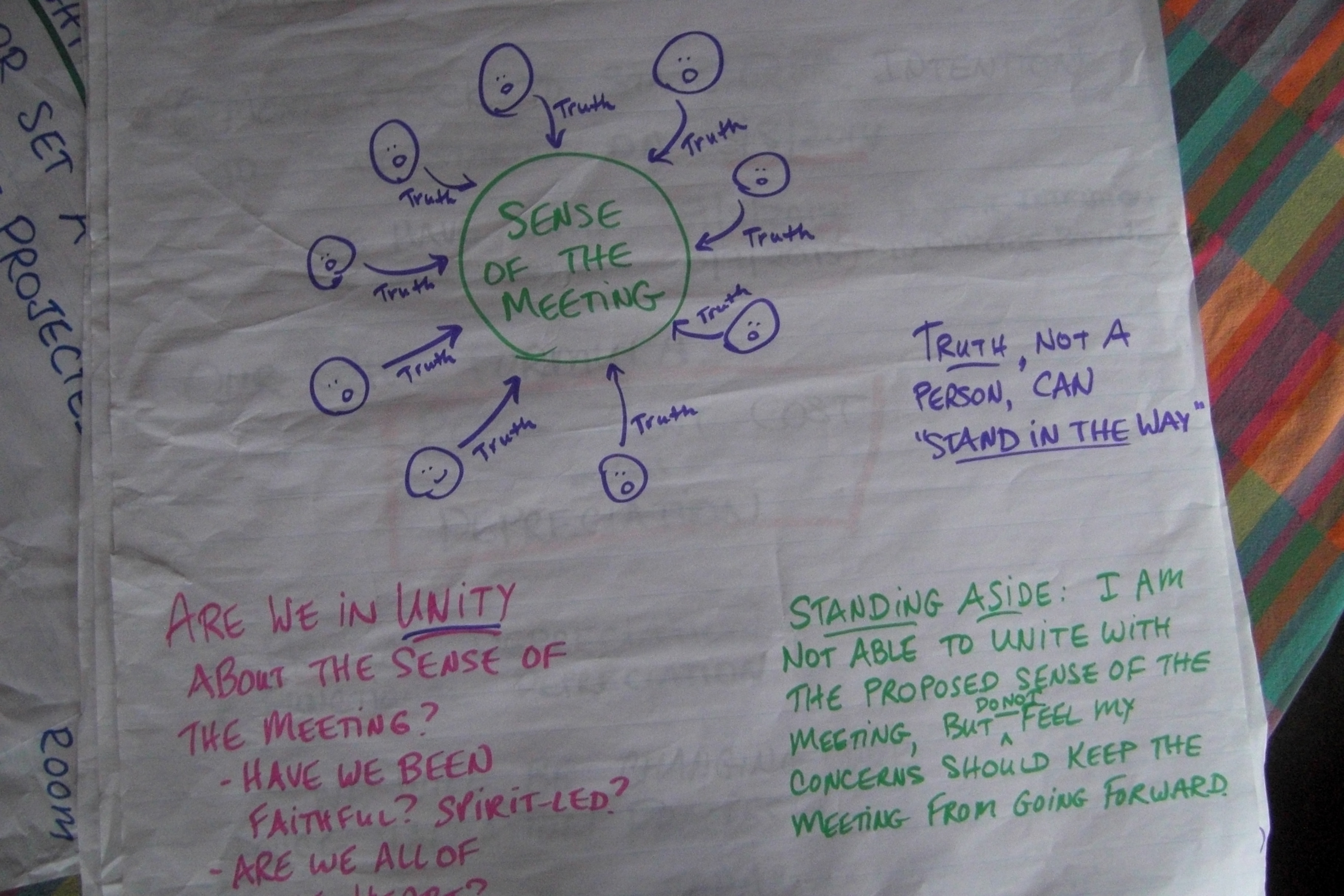 Luckily, I know places where it works differently, and for me it is a joy to participate in their Meetings. I realise now, because this flip-chart diagram helps me to articulate it, that what is happening is that everyone is having their say and then some, with good discipline to the acts of careful listening both to other people and to what lies in the silence between all the people, are Standing Aside. They are saying to themselves “I, my ego, am not convinced but my ego is being laid down because of the discernment of others and I am disciplining my ego to their discernment”. I’ve done it lots myself. Decision-making can actually move very fast and succesfully if you are a jelled group who have developed trust in each other and in that process. On one occasion, very memorable for me, I did not Stand Aside. I threw a wobbly and kept throwing wobblies, and it changed policy. It still happened fast, though – we must have made that decision in about 10 minutes. I was shaky afterwards, uncertain whether I’d done the right thing to be so insistent. I have no idea where it came from. It was only months later when chance remarks from others made me realise that others were glad of the outcome and it had probably been right.